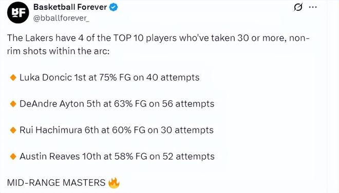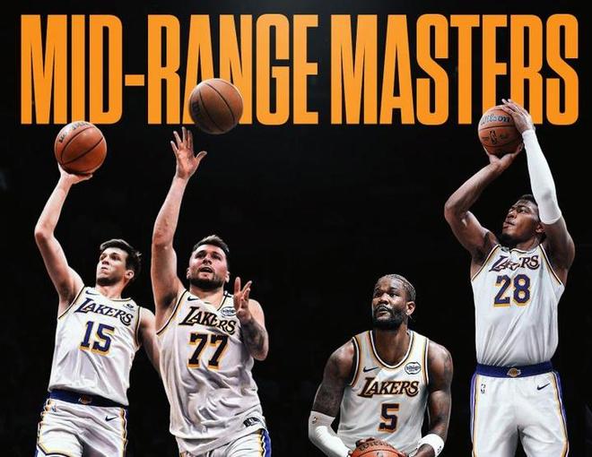沒想到這個賽季,湖人的中投已經(jīng)成為球隊的一大殺招。湖人內線有艾頓和八村壘兩位中投高手,外線有東契奇和里夫斯兩大中投高手。
